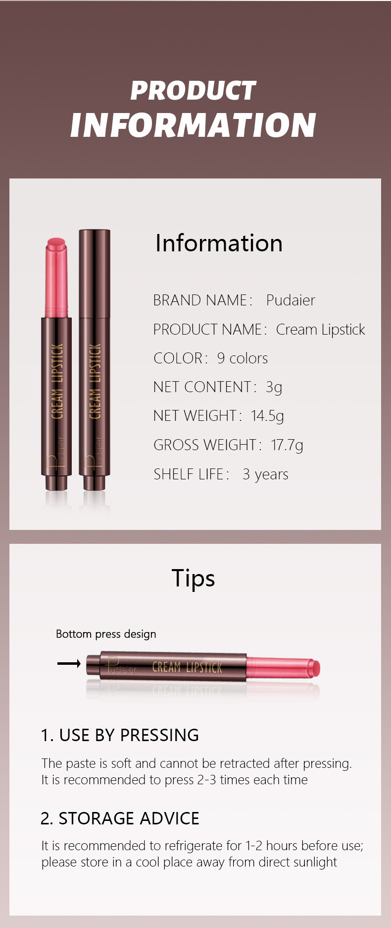 Lip color Pudaier 9 color moisturizing paint smooth mouth red non stick cup lip glaze lip gloss press lipstick lipstick