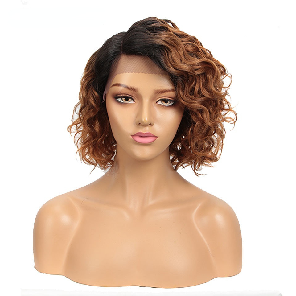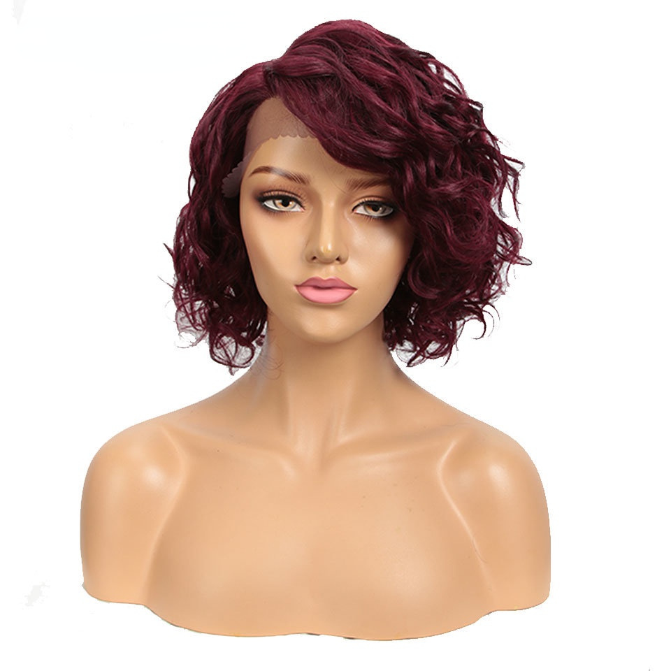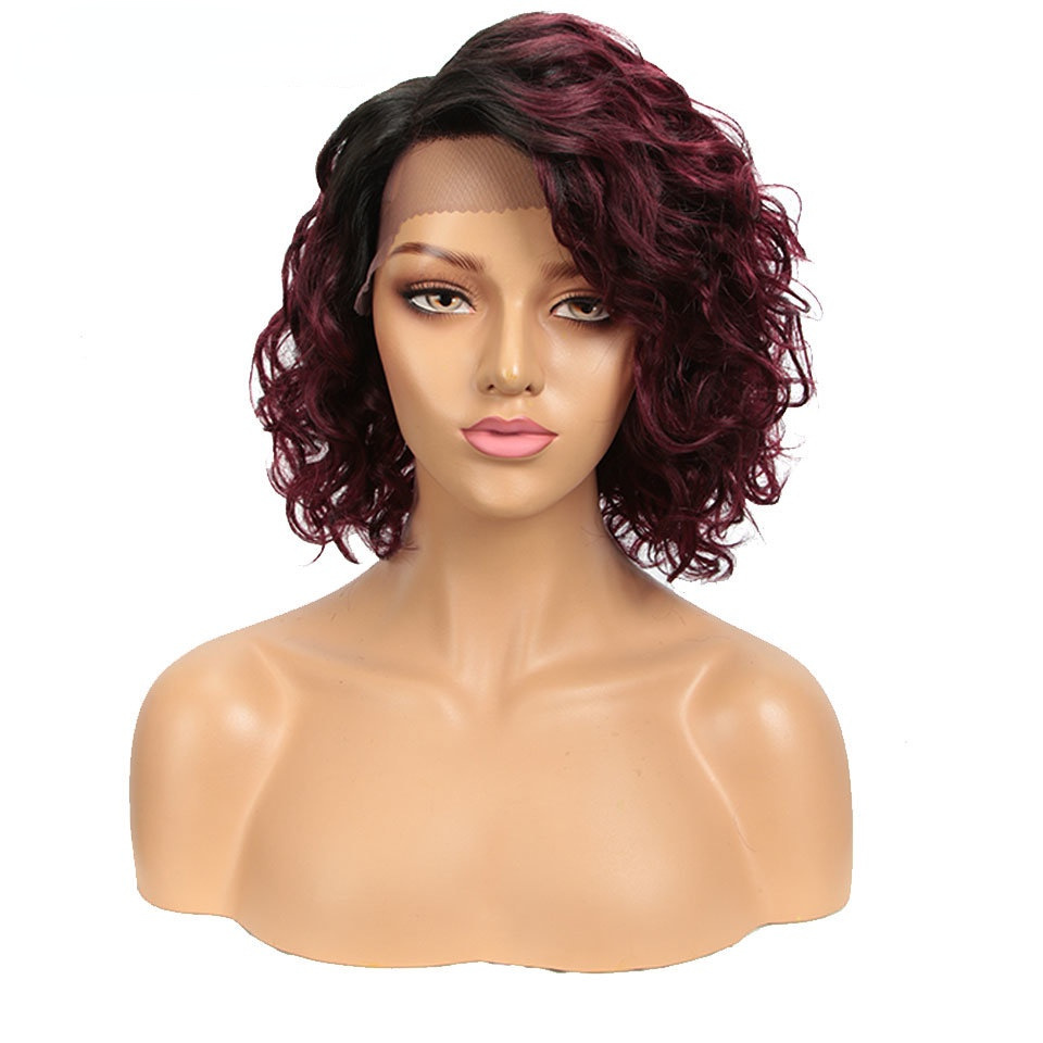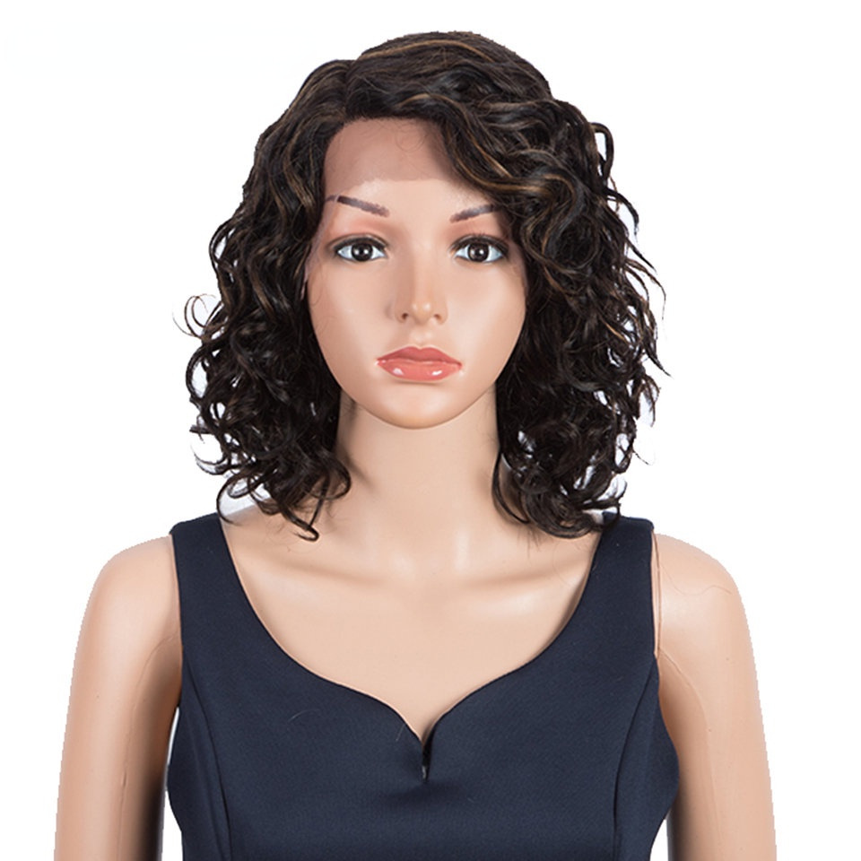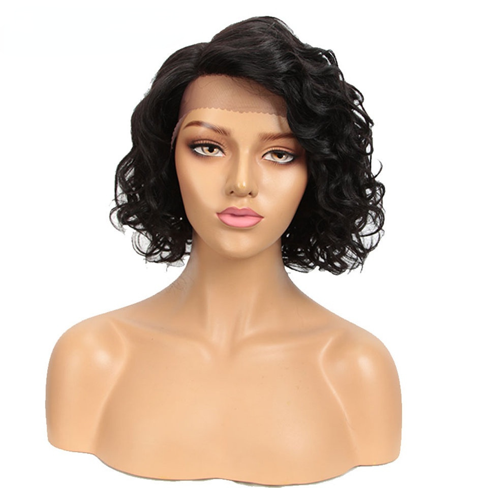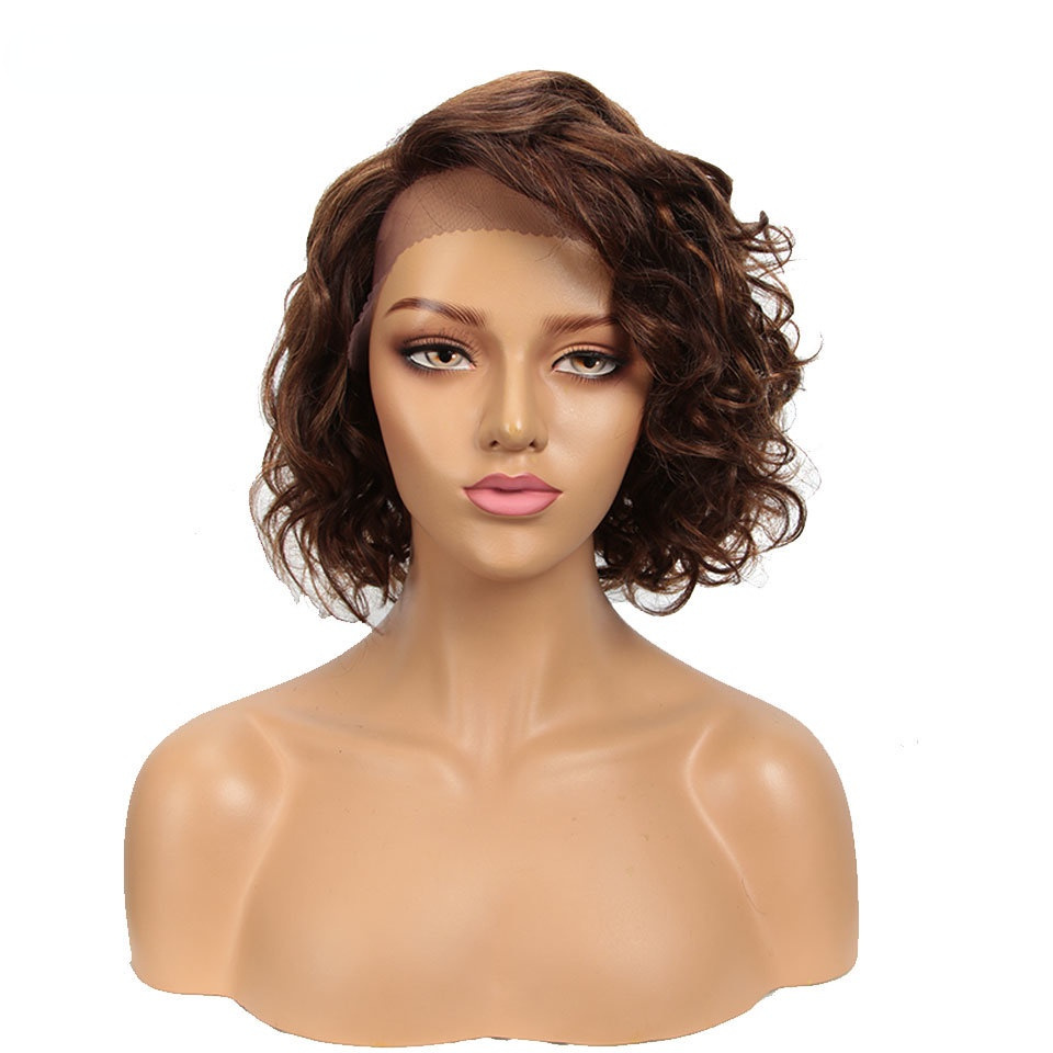 European and American wig black wig 12 inch fluffy exploding head bias forehead lace full hood human hair